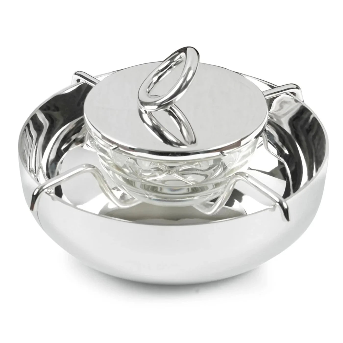 Este juego de tres piezas para servir caviar bañado en plata con el patrón Vertigo contiene un plato de presentación exterior para hielo y un recipiente con tapa que se ajusta perfectamente y que puede contener hasta 4,4 onzas de caviar premium. El atrevido motivo de Vertigo, un anillo grueso, sutilmente asimétrico y a menudo colocado torcido, se puede encontrar en cada pieza de esta colección de Christofle.